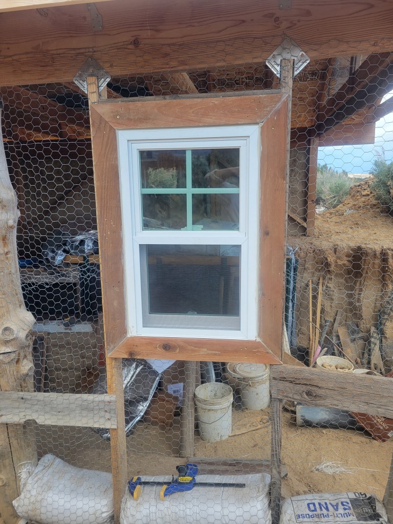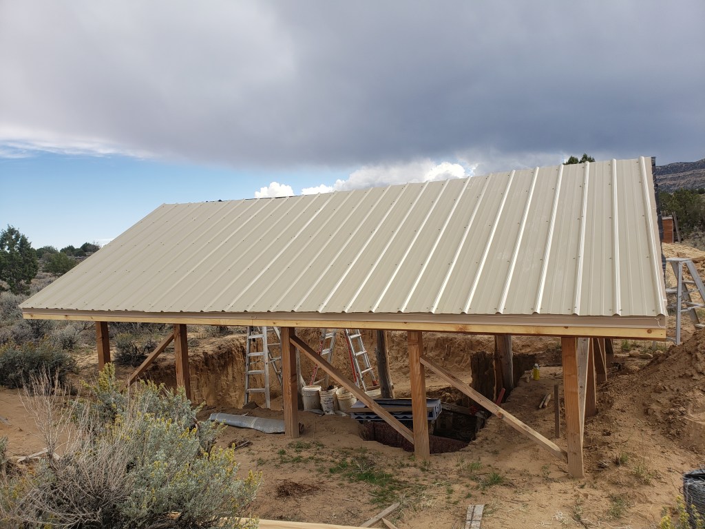 The Bunkhouse, presently under construction, will be a place for us to stay when it gets cold (and maybe to escape the heat and cedar gnats in warmer weather). It is earth-sheltered and semi-underground with around 100 square feet of interior space and additional space at grade level for beds. Earthen benches run along three walls, and there will be a small closet and a bookshelf underneath the beds.