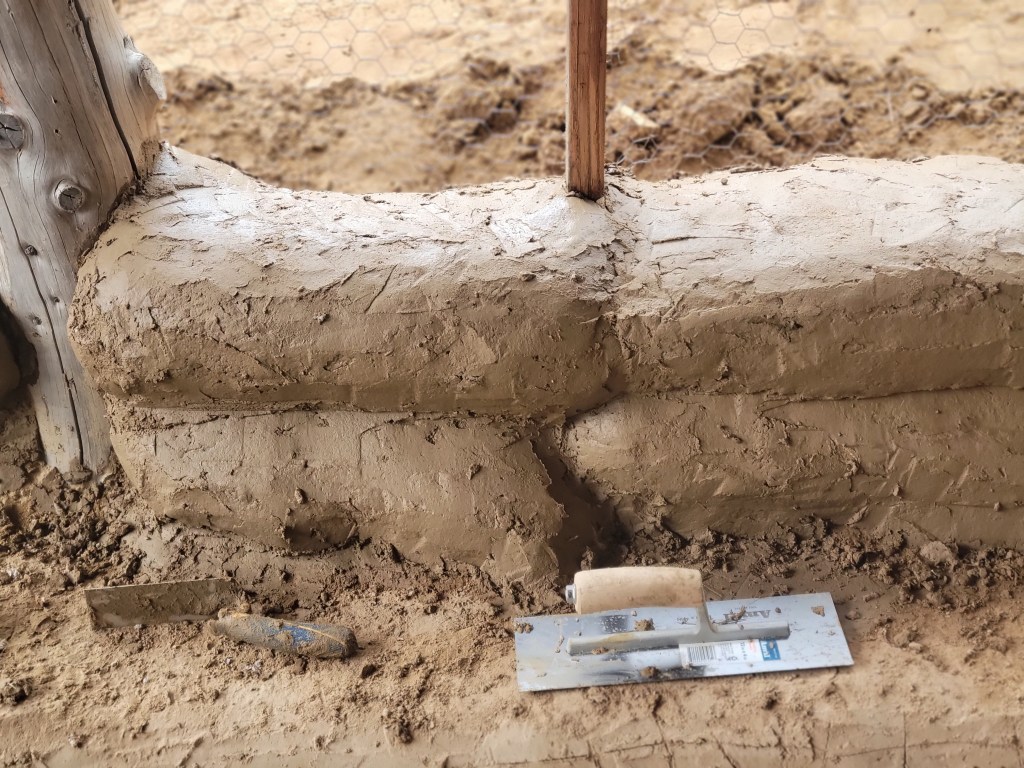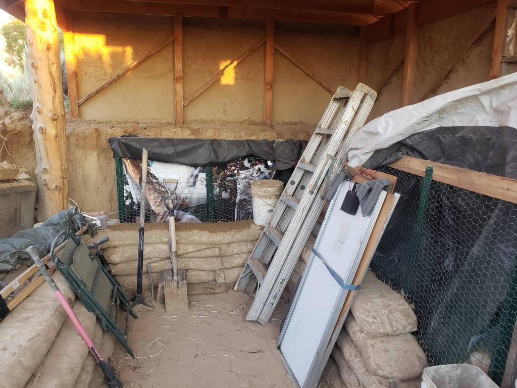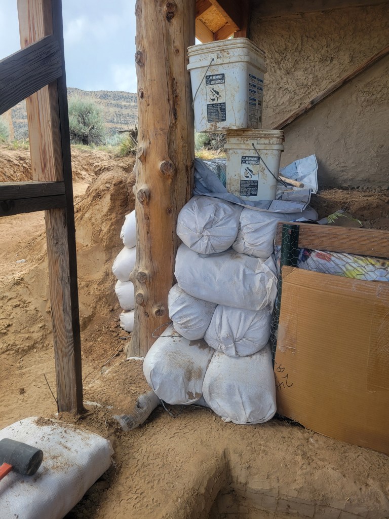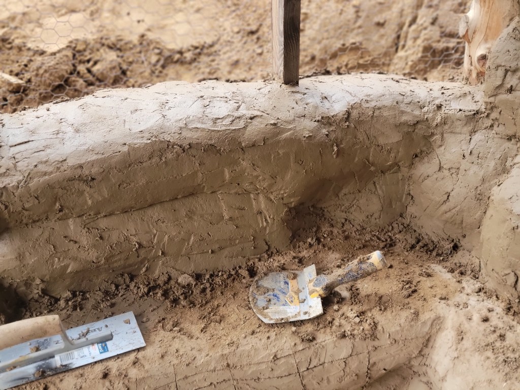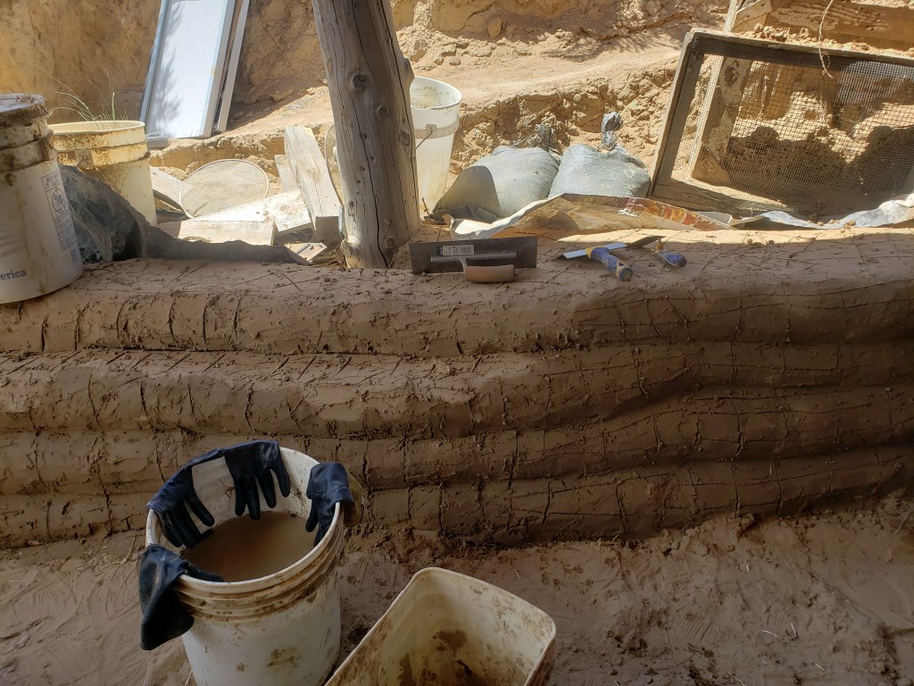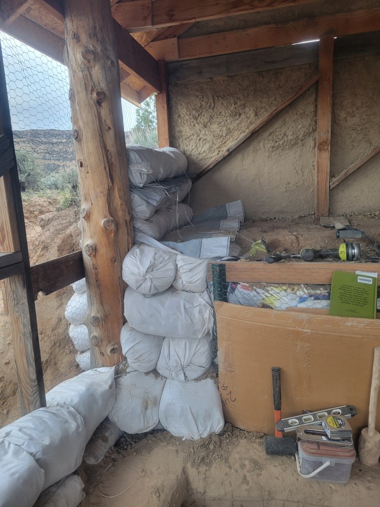Earthbags are used structurally as the base for some walls, as anchors for posts, and as retaining walls. They also serve as benches around the interior and eventually as benches on the exterior.