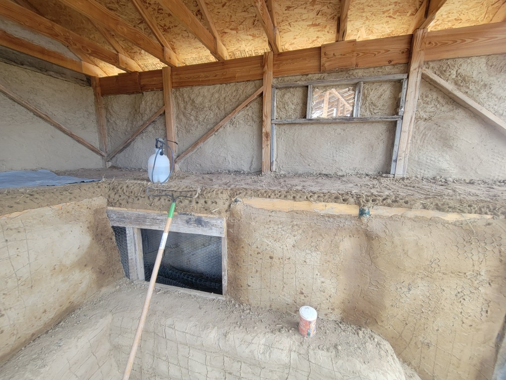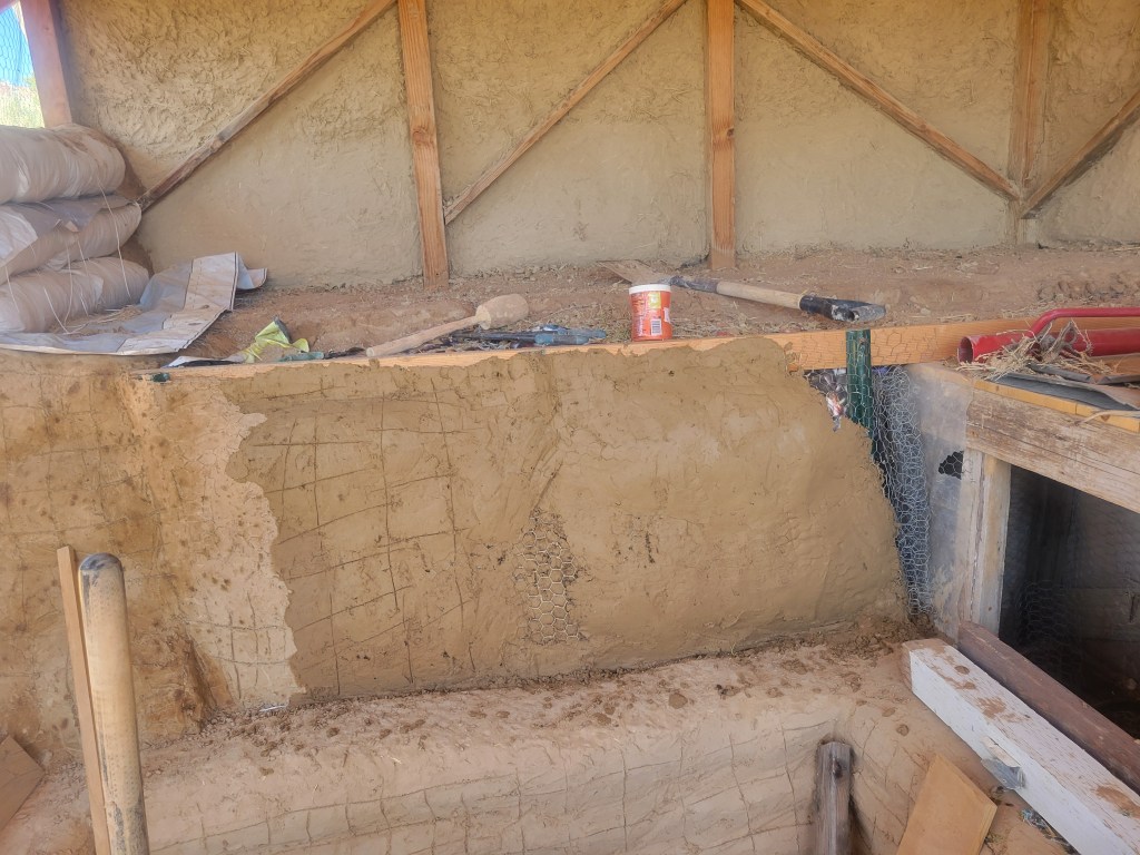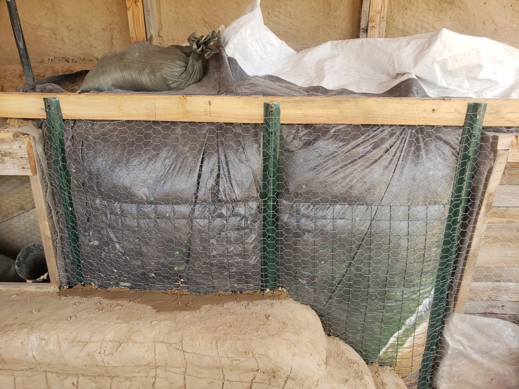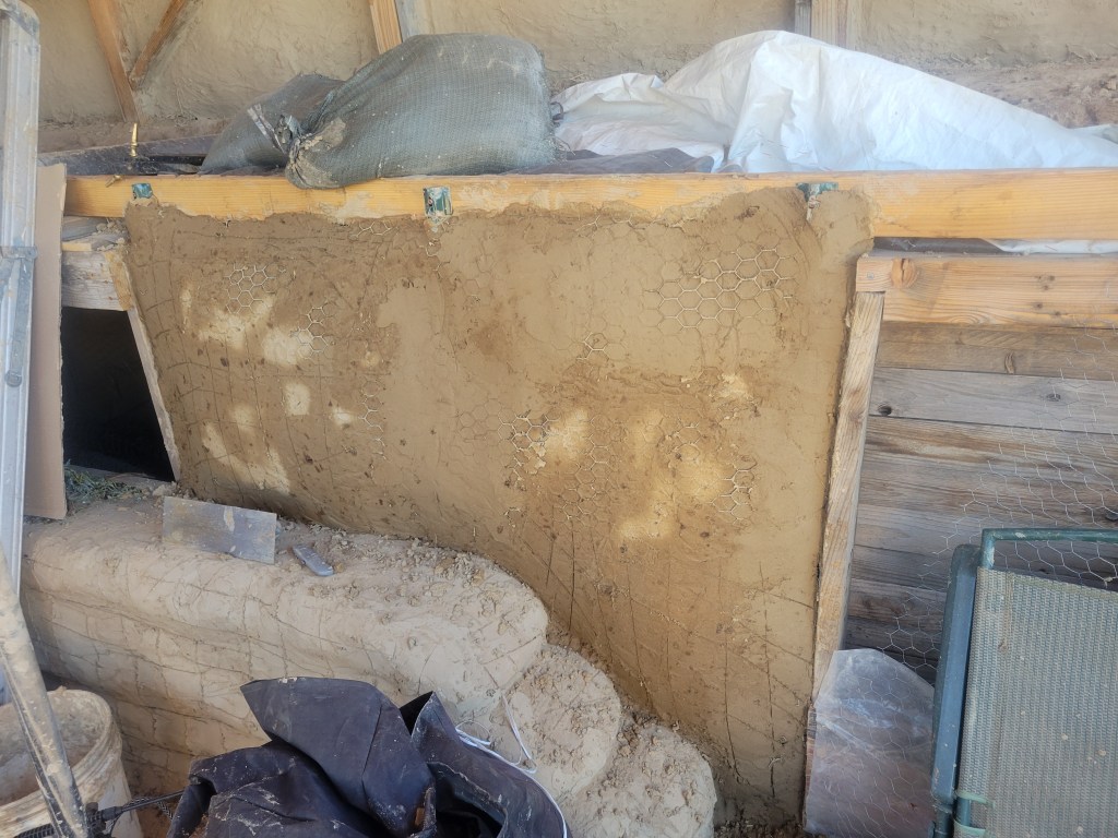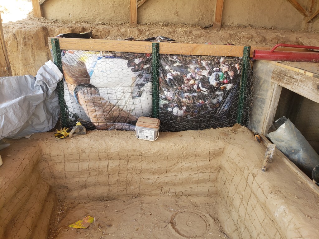 Rapidobe is a technique developed by Vela Creations. Posts are set where you want your wall and connected with a beam on top. If it were a free-standing wall, there would be two parallel lines of posts, which are tied together at the top to keep them from being stretched apart by the infilled earth. Since mine is a retaining wall, the posts tops are tied to the base of the outside wall with steel cables. A mesh to hold the plaster is run along the interior of the wall (I use chicken wire) and then a strong tarp is run inside the mesh (I use a recycled billboard sheet). The tarp must cover the bottom and run part way up the other side; when the earth infill is added, the weight keeps the tarp from slipping out. Four or five inches of damp earth is poured into the wall and tamped well. This continues until you reach the top. The tarp bulges out between posts, but this is part of the effect. Finally, the outside is plastered.